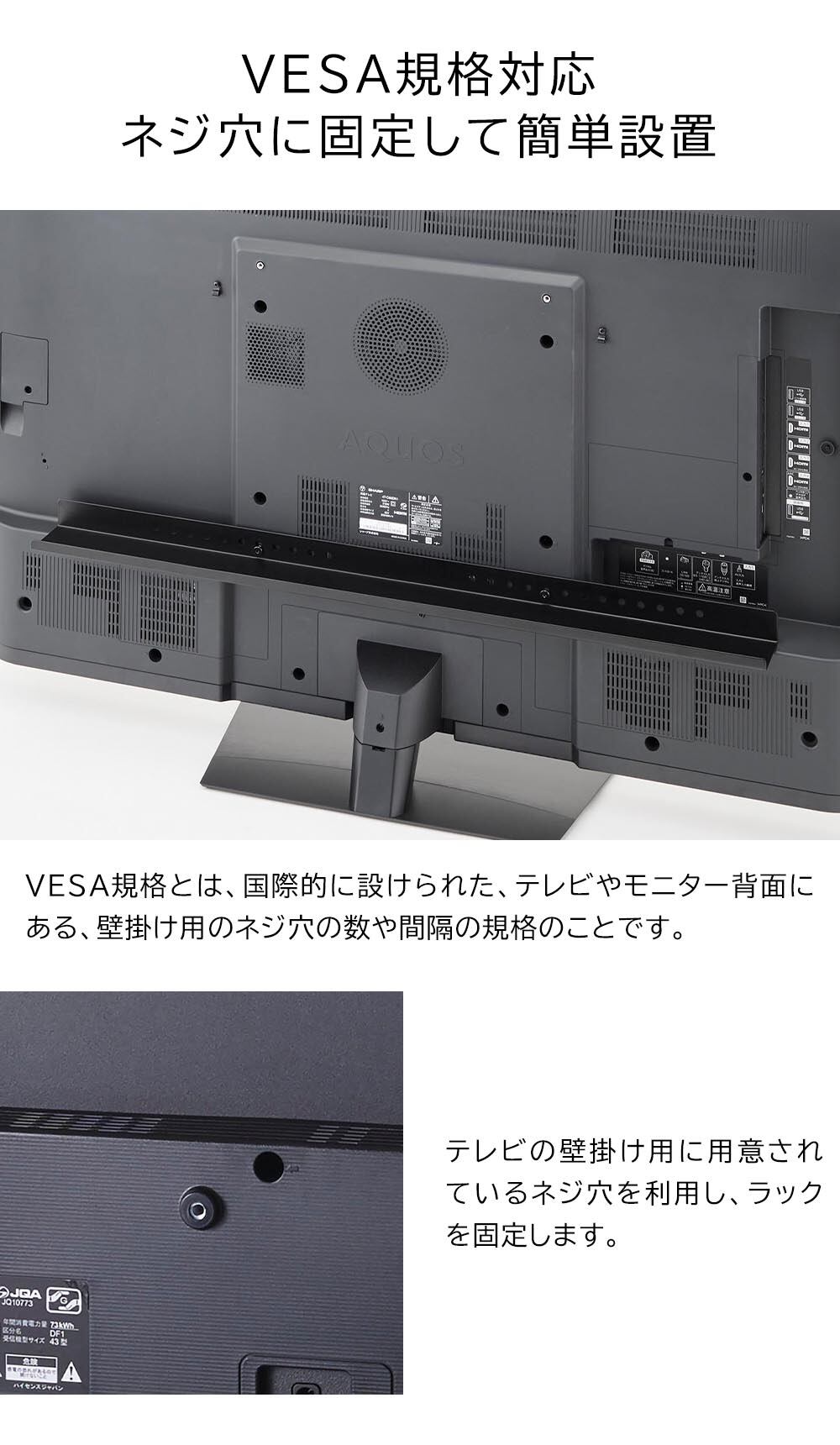 テレビ背面のネジ穴ピッチ:横20~75cm(2.5cm間隔) VESA規格対応の50~65インチのテレビを目安としています。