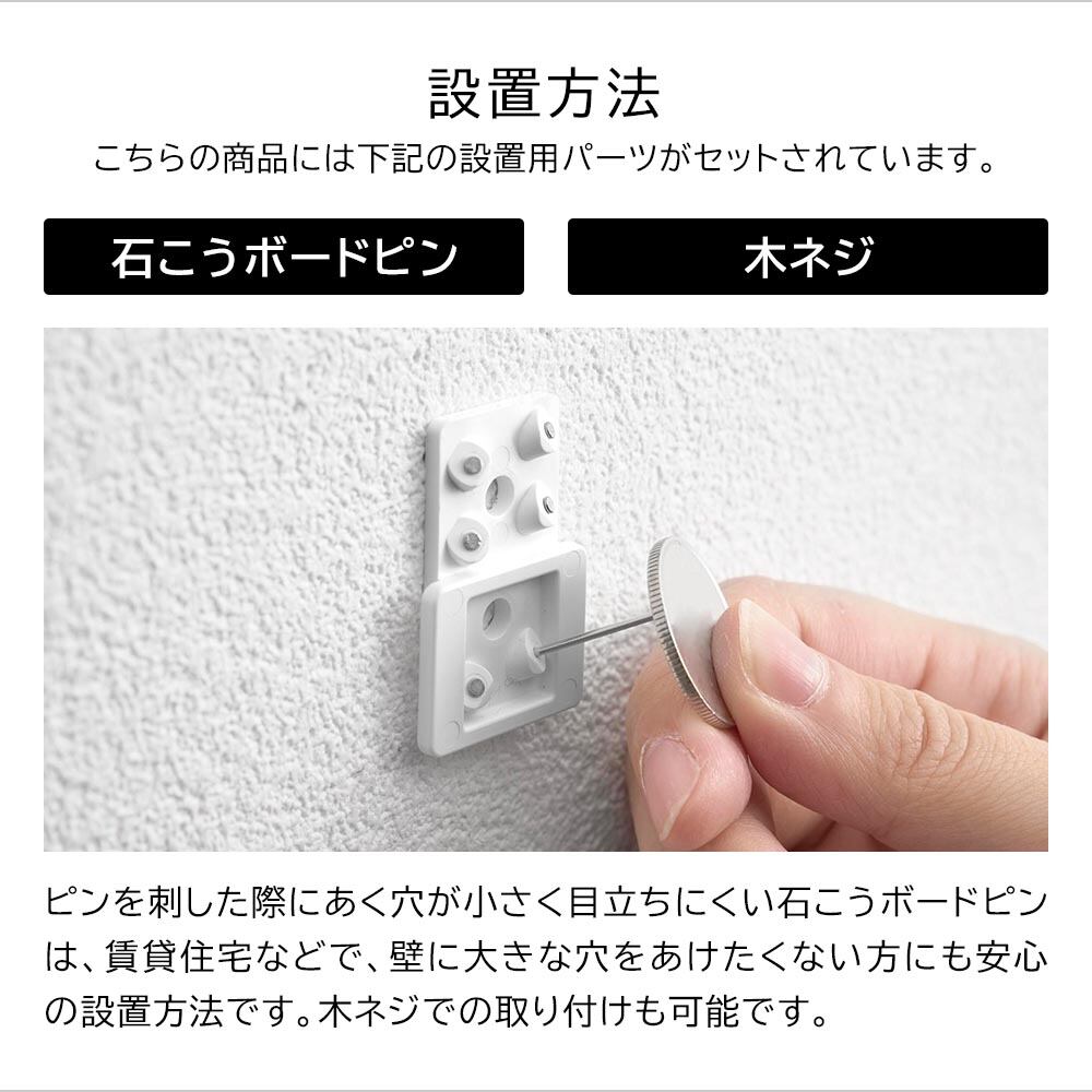 ■石こうボードピン使用時:壁紙・布壁紙・ビニール壁紙貼りなどの石こうボード・薄ベニヤ■木ネジ使用時:柱・板壁(厚さ1cm以上)・プリント合板(裏側に水平にサンがある場所)・裏に下地材(間柱)が入っている壁