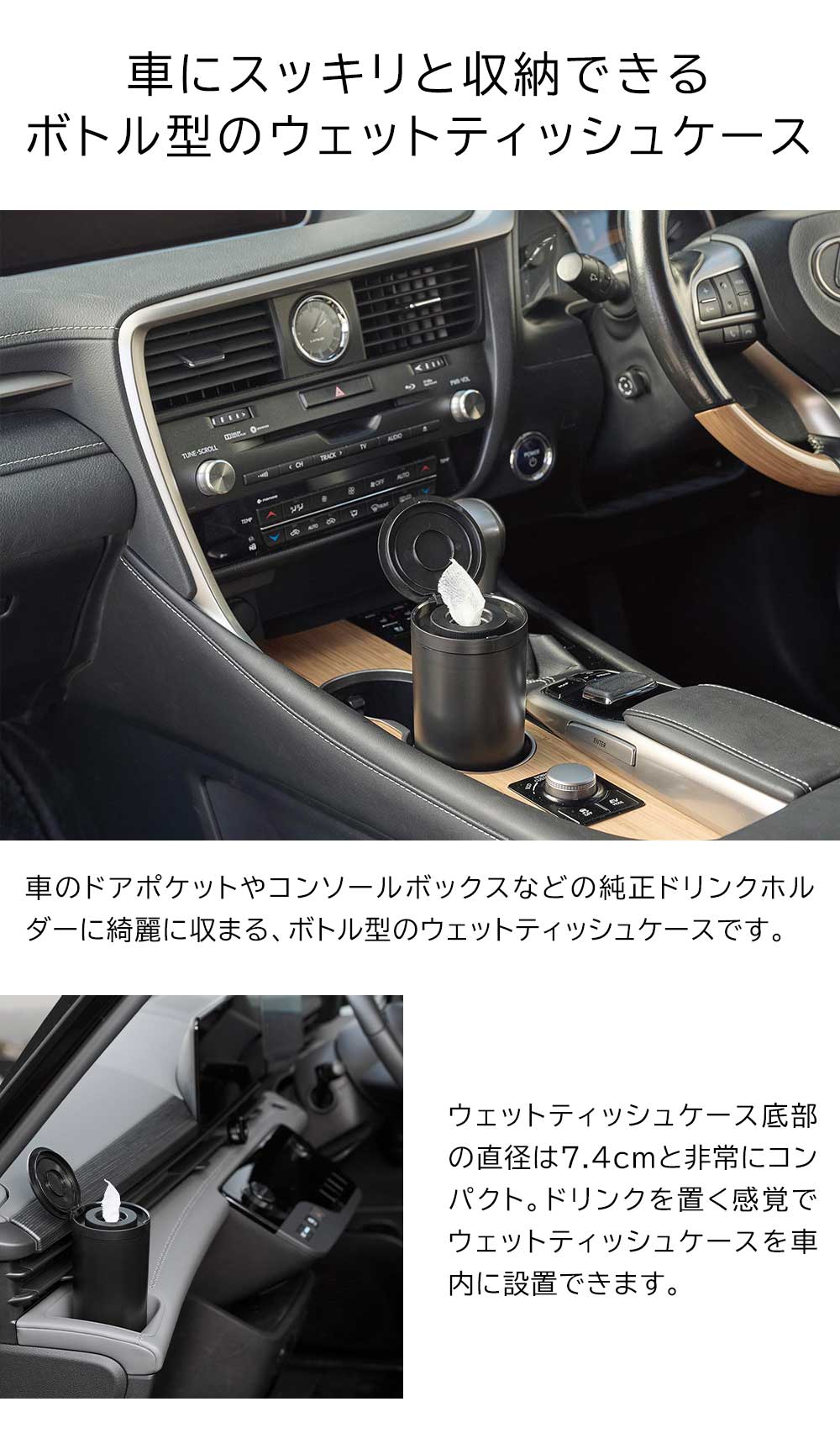 ■収納可能なドリンクホルダー:底部の直径7.4cmのサイズが入るドアポケットやコンソールボックス等の純正ドリンクホルダー