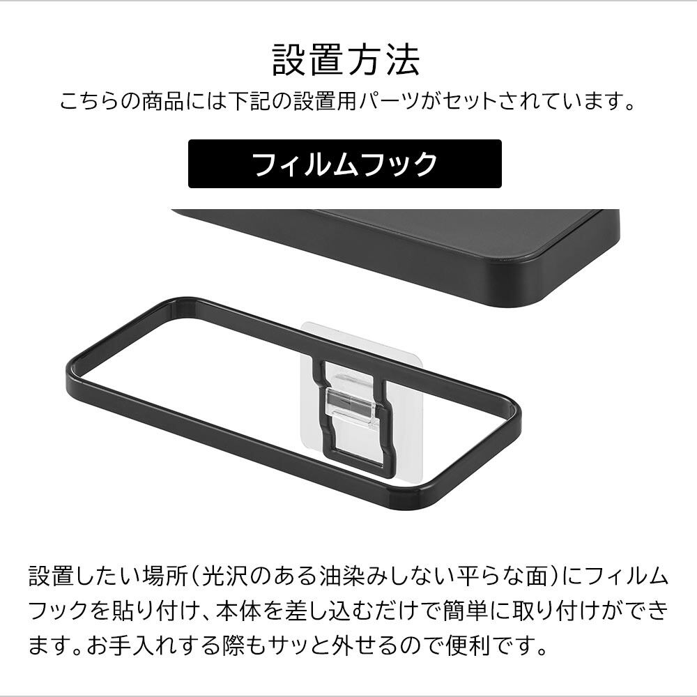 ■使用できる面光沢のある平らな油染みしない面で、フィルムフックの接着面よりも大きい面(タイル・プラスチック・ステンレス・ガラス・金属塗装面・人工大理石)