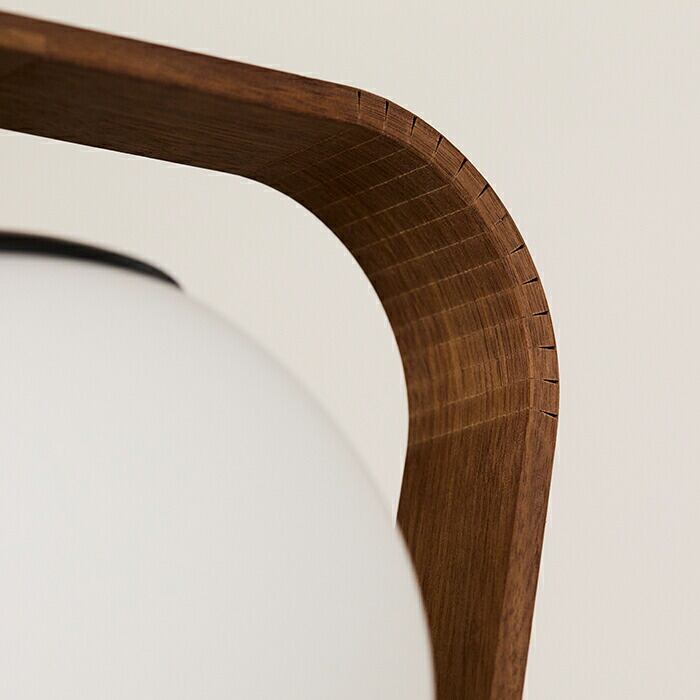 ウォールナットの無垢板を曲げた枠がアウトラインになったガラスペンダントライト。見える角度でシルエットが変わり、乳白ガラスとのコンビネーションが存在感を引き立たせます。