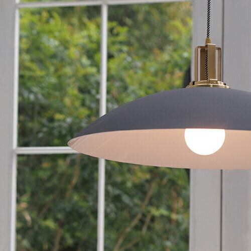 無駄を排した潔いシルエットに真鍮パーツ・モノトーンの布コードが上質感を際立たせています。真下から見た美しいシルエットも自慢。インテリアの主役としてリビングやダイニングなどにおすすめしたいペンダント照明です。シェードの表面はザラザラとしたマットな質感。内側は光を反射するオフホワイトで効率的に照らします。ベーシックカラーのブラック、グレー、ホワイトの3色の中から、用途やお部屋の雰囲気にあわせてお選びいただけます(シーリングカバーは真鍮製です)。