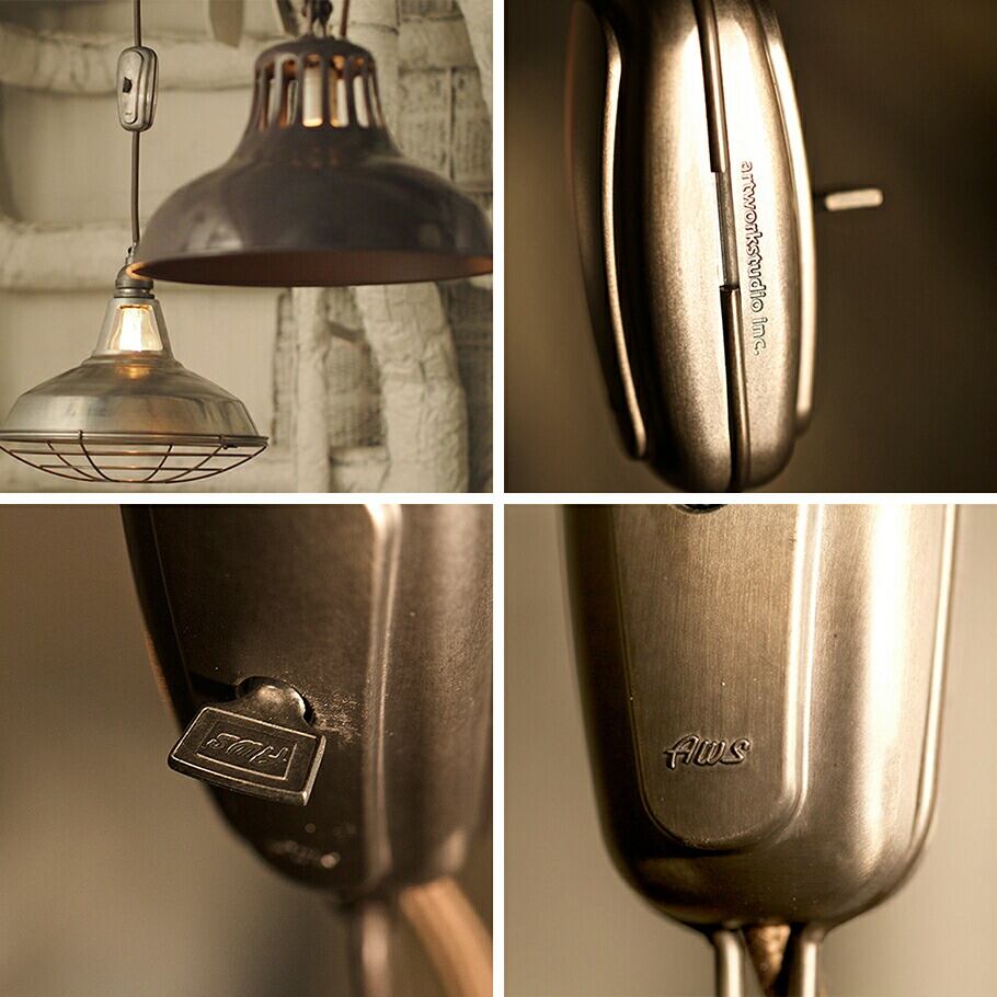 ペンダント照明のケーブルの長さを調節し、ケースの中に収納する事ができます。布製ケーブルはもちろん、付属パーツを使用するとチェーン付きペンダントにも対応が可能です。最大の特徴は、なんと言っても機能性抜群な上にお使いの照明器具のイメージを壊さないビンテージなデザイン。ずっしりとしたダイキャストの素材や色感、パーツのフォルムやロゴなど、細部にまでこだわりました。すべてオリジナルパーツを使用しているので、よく見るとAWSのロゴ入り。ケーブルの長さを調節しつつペンダント照明のアクセントとしても映えます。お持ちの照明に合わせて、「アロイ」「ブラック」「ゴールド」「ビンテージメタル」「グレー」「ホワイト」の6色からお選びください。