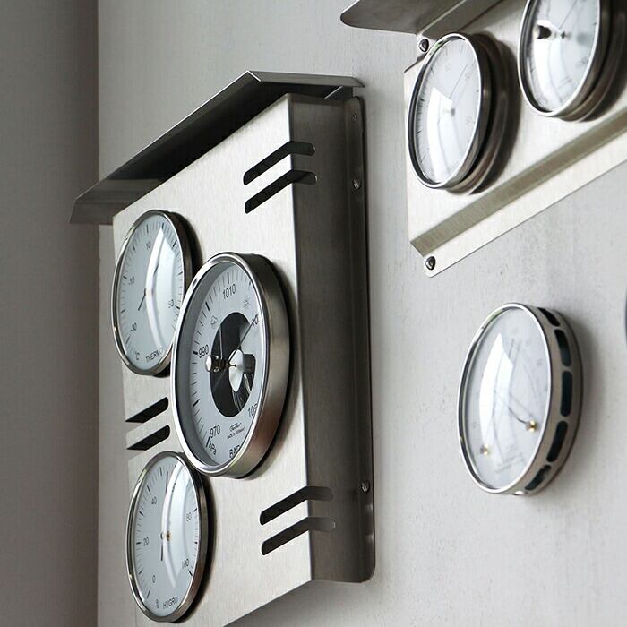 ドイツFischer-barometer社(フィッシャーバロメーター)によるステンレス製ウェザーステーション(温湿度気圧計)。温度計、湿度計、気圧計が並んで配置され、屋外でも使用可能なデザインとなっています。