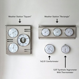 ステンレス製の本体でシンプルでミニマルな佇まいはお部屋の中でも存在感があります。本体上部は浅めの屋根が付いていますが、本体に水分が直接かかると故障の恐れがある為、屋内での使用をお勧めします。気圧計部分は設置する地域の気圧情報を元に中心の目安針を調整し、半日~1日後にその間の気圧の流れを指針の動きで確認します。