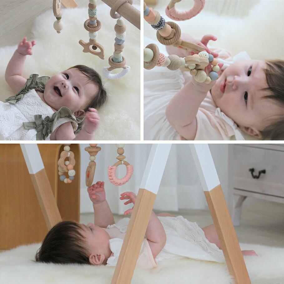 赤ちゃんが楽しく笑顔になれる優しい素材のハンギングトイ。安全に遊んでいただけるように設計されています。