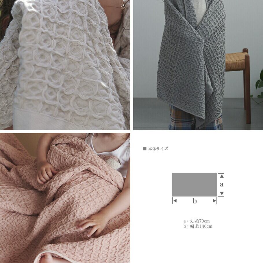 洗うたびにふわふわで気持ちいい、オーガニックコットンのワッフル素材でふんわりと快適に。肌触りも柔らかで通気性にも優れています。寸法は70×140cm。大人の体もしっかりと拭き上げるサイズです。