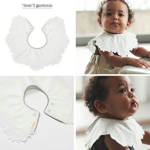 【No.2:gardenia】は、クチナシの刺繍をぐるりとあしらった可憐なスタイ。初夏に満開を迎えるクチナシは、甘く優しいかおりが人々を幸せな気持ちにすることから「喜びを運ぶ」という花言葉や、「とても幸せです」という意味を持っています。笑顔の赤ちゃんを抱いて、幸せに包まれる家族をイメージした1枚です。繊細で贅沢なディティールを引き立たせるために、あえて襟ぐりはサテンパイピングを施すだけのシンプルなデザインに。クラシックかつモダンでどんなお洋服にも合わせやすく、付け襟としてもご使用いただけます。