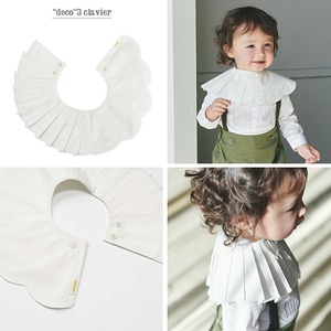 【No.3:clavier】は、前後左右、どこから見ても見え方が違う、360度を楽しむスタイです。プリーツやスカラップをレイヤードさせ遊び心を詰め込んだデザイン。メンズシャツでよく使用されるブロードの素材を採用し、ステッチワークを効かせたスタイは、スタイリッシュな付け襟にも。ベビーのどんな表情もモードに引き立てる、こだわりのつまった1枚です。