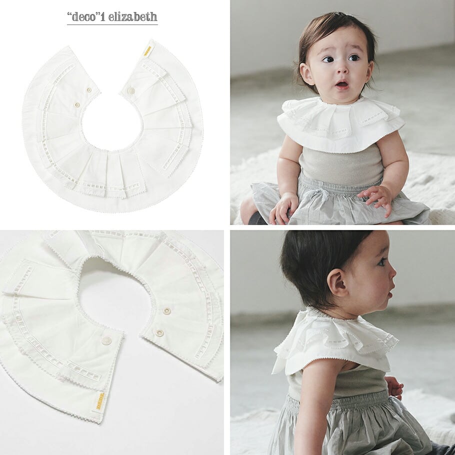 象徴的な形の「エリザベスカラー」からインスパイアされた【No.1:elizabeth】は、ベビーの無垢な可愛らしさを引き立てるオフホワイト。プリーツを繊細なピコレースで縁どり、360°どこから見てもかわいい贅沢な1枚です。いつものお洋服に合わせるだけで、リュクスな気分が味わえます。
