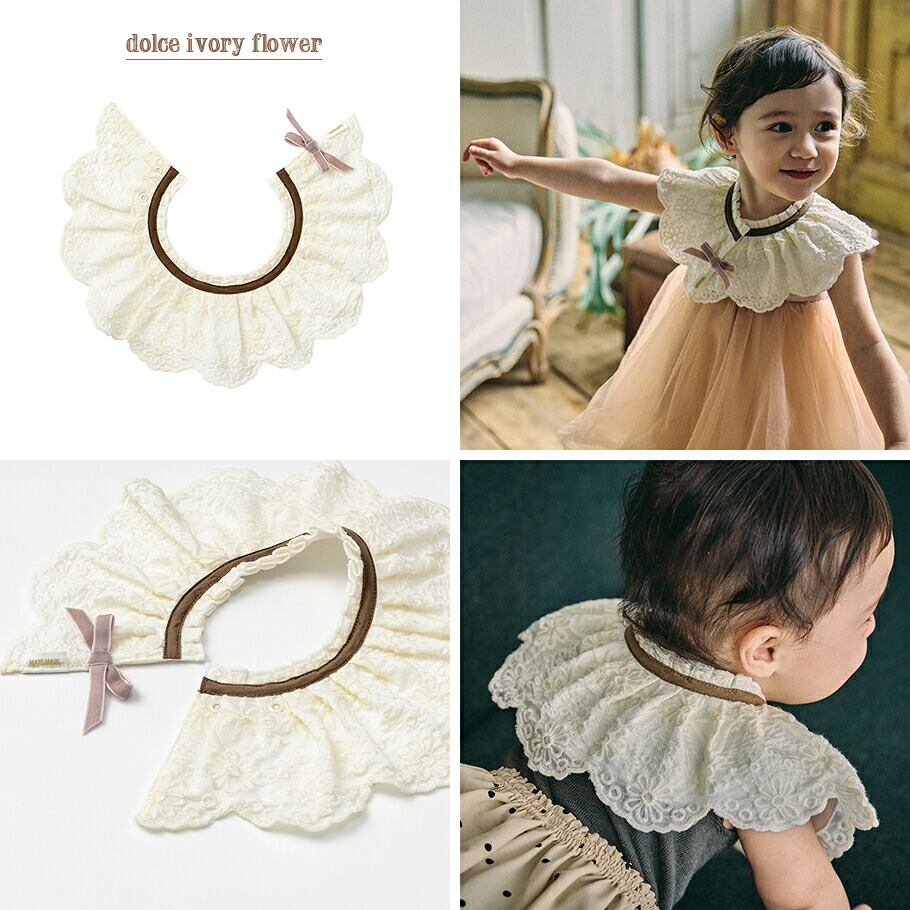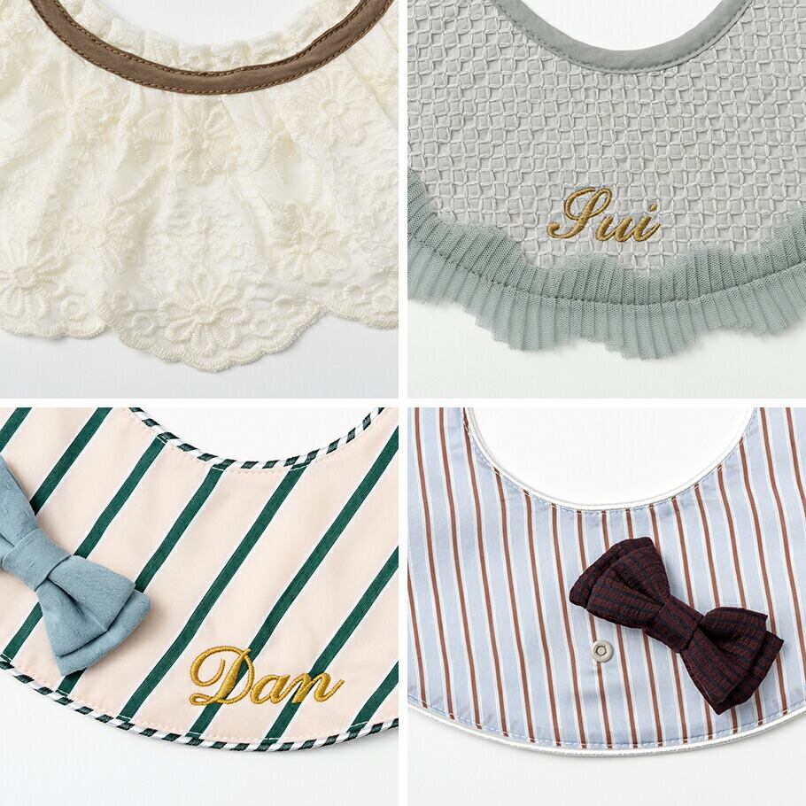 【1:lace collar(1:レースカラー)】コットンレースを贅沢にあしらった、付け襟風のデザイン。ベロアリボンは後ろ姿のポイントになりますが、あえて前にもってきてもかわいいです。くるくるまわっても、どの角度からでもおしゃれに。ちょっとしたパーティーなどで、アクセサリー感覚で使ってもいいですね。ベースはガーゼ生地で肌触りが良く、よだれの吸収力も優れています。出産祝いやハーフバースデーのお祝いにもぴったり。