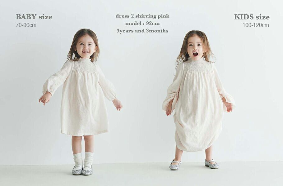 袖と身頃に長さを調整できるドローストリング機能がついているため、お子さまの成長に合わせて丈の調整も可能に。70~90cm(ベビーサイズ)、100~120cm(キッズサイズ)の2サイズ展開です。 袖や身頃を絞ることによってシルエットもふんわりと変化。ドレスとしてはもちろん、レギンスやパンツと合わせればロング丈のトップスとして。1枚で幅広いコーディネートをお楽しみいただけます。どんなシチュエーションにも自然と溶け込むドレスです。襟ぐりは、スモッキング刺繍が施されています。ゴムを使用しているため、どのサイズでも首にフィットするデザインです。また、薄い素材感のためインナーワンピースも付属。dressはもちろん、お手持ちのワンピースを着るときにもお使いいただけます。