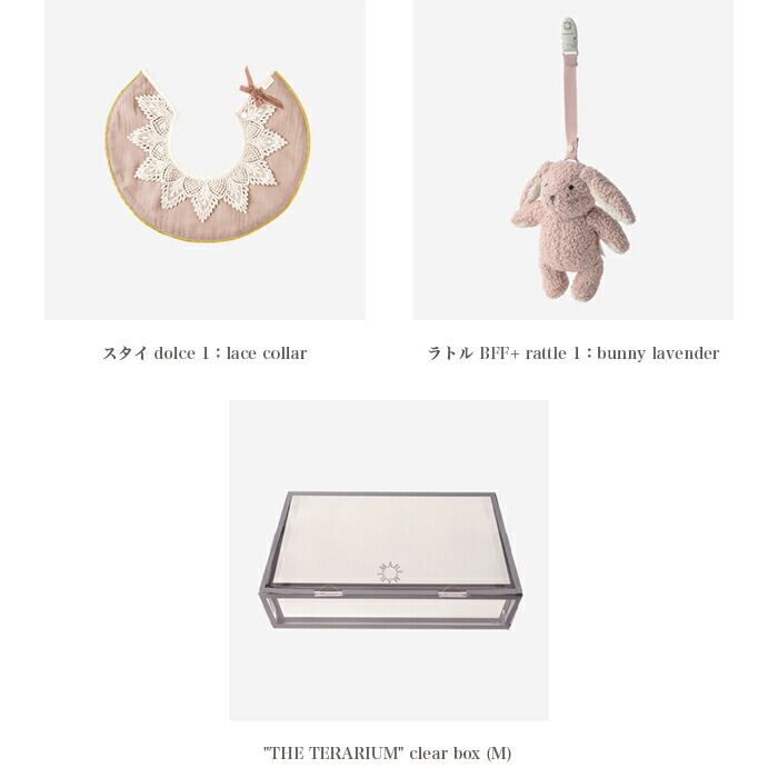 小さなうさぎのラトルとコットンレースをたっぷりあしらった花束のようなスタイのギフトセット。ベビーをやさしく包み込むようなピンクに囲まれて。