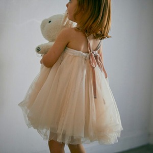 【ロングユース】1サイズ2WAY仕様で、肩紐のリボンをウエストに付け替えることで簡単にスタイルチェンジが可能。ベビー期~3歳前後まではベアトップワンピースとして、キッズ期はチュールスカートとして6歳ごろまで着られます。