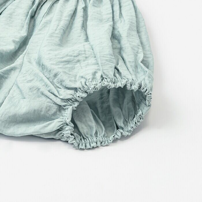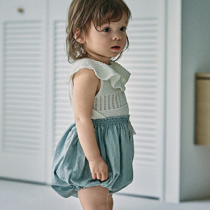 繊細な生地と爽やかなダスティブルーが映える”まあるいブルマ”です。ベビー期ならではの丸みをとことん愛でる1着へ。