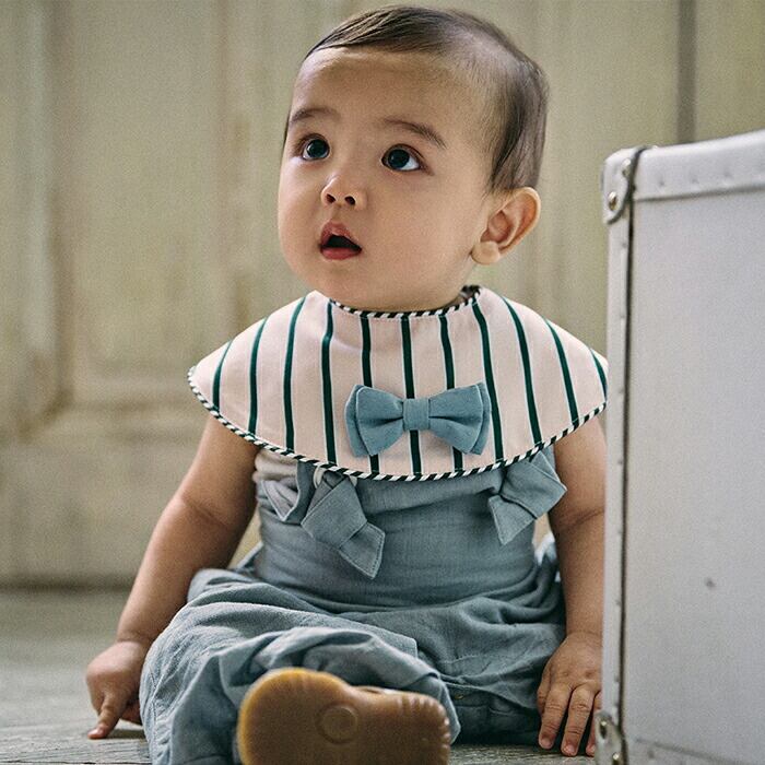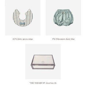 【セット内容】華やかさと品の良さを両立したフォーマルスタイルのスタイ。グリーン×ピンク地に水色の蝶ネクタイでポップな印象に。取り外しできるタイは日常からオケージョンまで大活躍します。 たっぷりのボリューム感がキュートなブルマは、着回し抜群のウエアです。シンプルなダスティブルーに、さりげない織り柄の生地がアクセント。透けづらく薄手の心地良い手触りです。