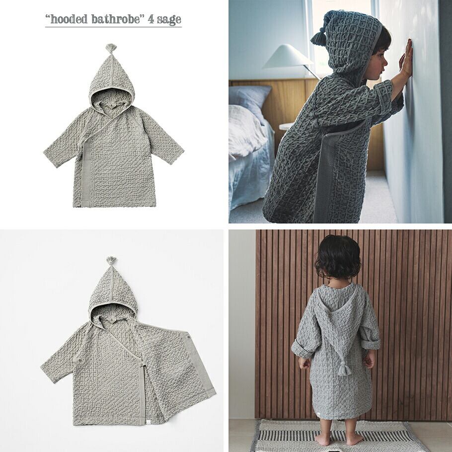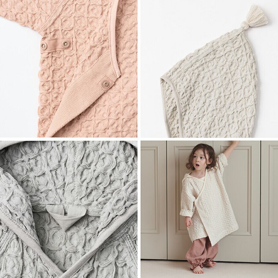 ふんわりと軽いオーガニックコットンのワッフル生地で素肌もさらりと快適に。タッセル付きのとんがりフードとゆったりシルエットは、お風呂上がりの子どもの姿をよりキュートに演出します。日常の何気ない瞬間がさらに愛しく。