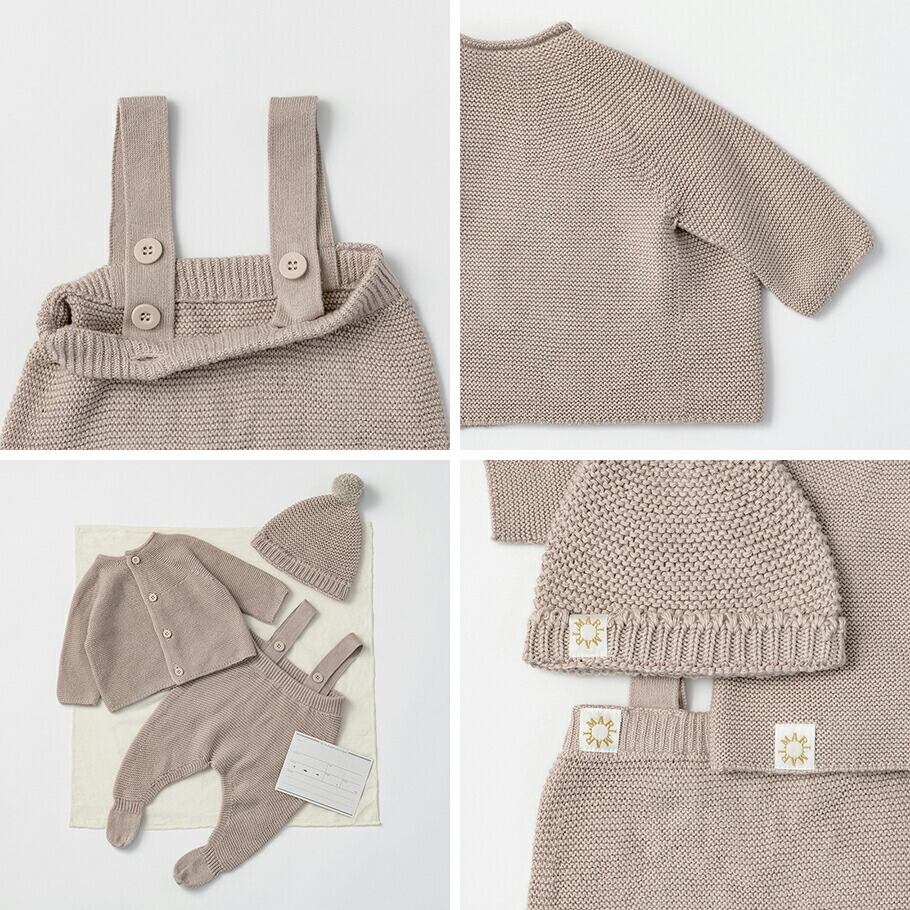 【ロングユース】ニットパンツは、2段階の肩紐調整が可能。カーディガンは袖をロールアップすることで、成長に合わせて1歳ごろまで着用できます。アイテムごとに単品使いをしても◎。