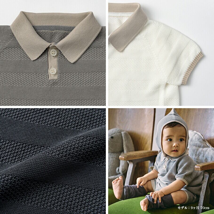 ファッション性と縫い目のないニットで丁寧に編み立てた着心地にこだわった半袖ニットロンパース。高級感のある配色と編み地で愛らしく心地良く。品の良さと機能性を両立させたベビーのための夏のウエアです。