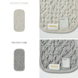 外出時にポケットに入れて、子どもが携帯しやすいサイズ感です。小さなお名前スペースも付属します。また、MARLMARLオリジナルのオーガニックコットン100%のワッフル生地を使用。柔らかでさらりとした使い心地は、長く使うほど更に肌馴染みの良い手触りへ。