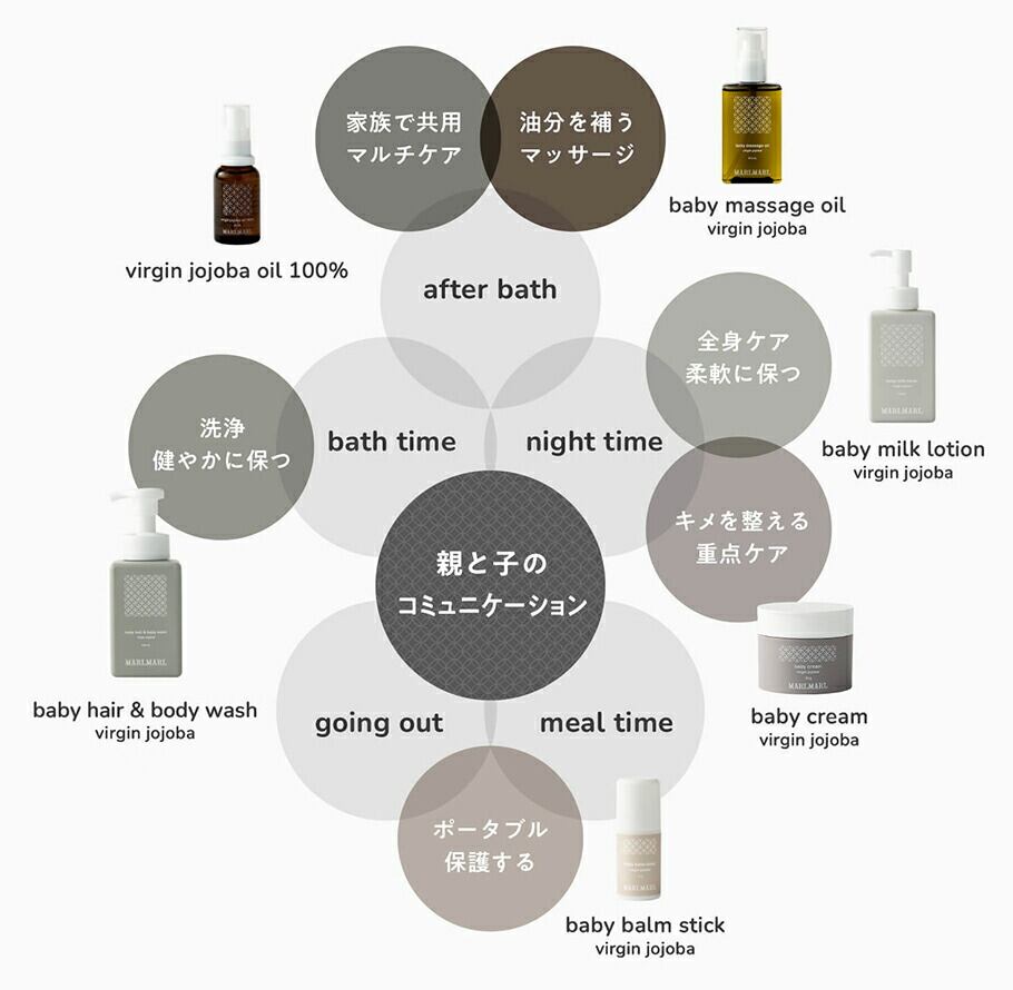 ホホバオイルとは“ホホバツリー”の種子から搾油した植物性のオイル。不足した油分を補うことがベビースキンケアの基本ととらえ、全てのアイテムに、希少なRESPLE(レスプル)オーガニックホホバシードオイルを配合しました。