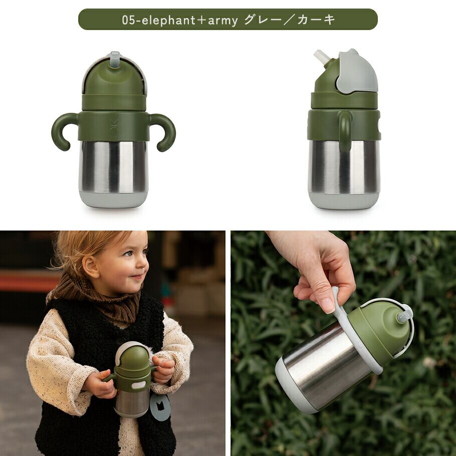 フリップトップ式のフタにストローをしまえて、カチッと閉まるので、おでかけの時にも安心です。小さな子どもでも飲みやすい、やわらかいストローの先にはボールが付いていて、どのアングルからでもこぼさず飲みやすいよう、飲む量を調整してくれます。また、ストローは簡単に取り外して洗え、交換も可能(別売り)です。また、小さい頃はハンドルを付けてストローマグとして、大きくなってからはハンドルを外してウォーターボトルとして、成長に合わせて使うことができます。